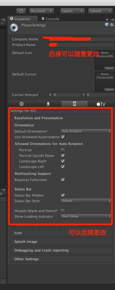 其中屏幕方向一般都选择为 Auto Roatation , 后续可在 iOS 代码中控制进游戏横竖屏。