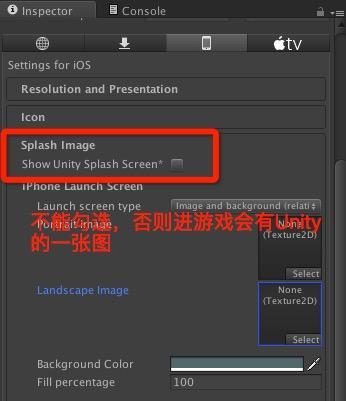 4、如果选中 Splash Image 中的 Show Unity Splash Screen 则会在启动App的时候多一个 Unity 自己的界面,所以建议不要勾选。
