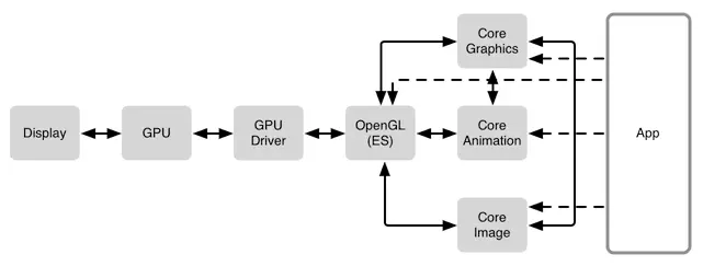 手机包含两个不同的处理单元,CPU 和 GPU。CPU 是个多面手,并且不得不处理所有的事情,而 GPU 则可以集中来处理好一件事情,就是并行地做浮点运算。事实上,图像处理和渲染就是在将要渲染到窗口上的像素上做许许多多的浮点运算。通过有效的利用 GPU,可以成百倍甚至上千倍地提高手机上的图像渲染能力。下面的流程图显示了一个图像渲染到屏幕的流程。
