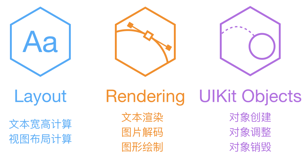 ASDK 认为,阻塞主线程的任务,主要分为上面这三大类。文本和布局的计算、渲染、解码、绘制都可以通过各种方式异步执行,但 UIKit 和 Core Animation 相关操作必需在主线程进行。ASDK 的目标,就是尽量把这些任务从主线程挪走,而挪不走的,就尽量优化性能。