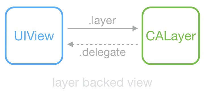 这是常见的 UIView 和 CALayer 的关系:View 持有 Layer 用于显示,View 中大部分显示属性实际是从 Layer 映射而来;Layer 的 delegate 在这里是 View,当其属性改变、动画产生时,View 能够得到通知。UIView 和 CALayer 不是线程安全的,并且只能在主线程创建、访问和销毁。