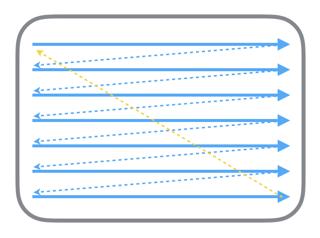 首先从过去的 CRT 显示器原理说起。CRT 的电子枪按照上面方式,从上到下一行行扫描,扫描完成后显示器就呈现一帧画面,随后电子枪回到初始位置继续下一次扫描。为了把显示器的显示过程和系统的视频控制器进行同步,显示器(或者其他硬件)会用硬件时钟产生一系列的定时信号。当电子枪换到新的一行,准备进行扫描时,显示器会发出一个水平同步信号(horizonal synchronization),简称 HSync;而当一帧画面绘制完成后,电子枪回复到原位,准备画下一帧前,显示器会发出一个垂直同步信号(vertical synchronization),简称 VSync。显示器通常以固定频率进行刷新,这个刷新率就是 VSync 信号产生的频率。尽管现在的设备大都是液晶显示屏了,但原理仍然没有变。